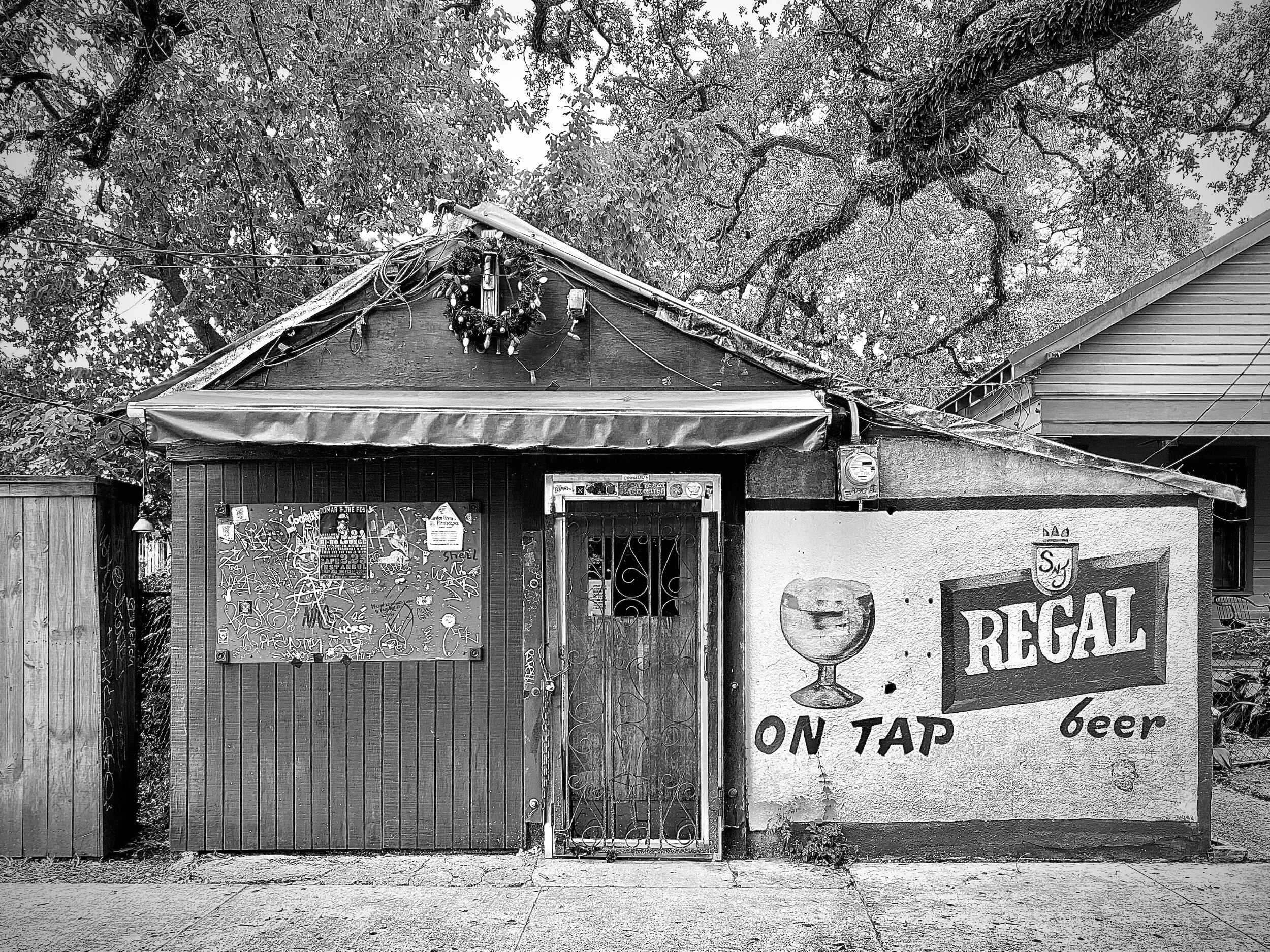 Located well off the beaten path, in the Carrollton Square area, I knew that it would take some intentional effort on my part to guide us away from the French Quarter on a Saturday night. After a day of drinking out on an air-boat in the bayou, I took the opportunity to get our group to take a walk through this mostly residential neighborhood. As we explored, I fielded questions from my friends, asking if there was really a bar around (The easy answer is “YES” it’s New Orleans, there’s always a bar around.) As we turned a corner, there stood a shack with no windows, an iron security door, and the simple word BAR written on the wall. The true calling card of the best dives is the complete lack of a sign, and this was no exception. Above the door was a single lit wreath, confirming for all who enter that it really is Christmas all year round at Snake and Jake’s.